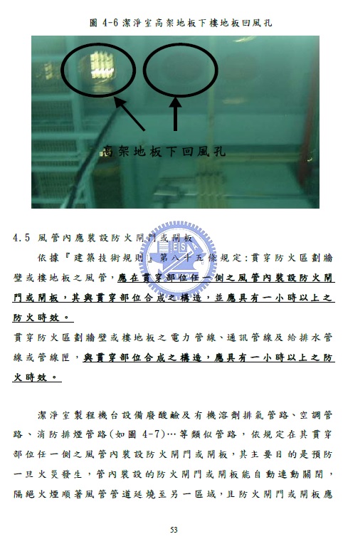 …半導體生產過程中,晶圓自動化傳輸系統貫穿上下樓層間、高架地板下樓地板回風孔(如圖4-6所示),型成貫穿樓地板開口,已破壞垂直防火區劃,並違反該法條樓地板應為連續完整面規定,一旦發生火災或化學氣體外洩,火焰、煙及氣體將隨著這些開口(孔)向另一樓層延燒擴散,垂直波及到另一樓層人員、財產安